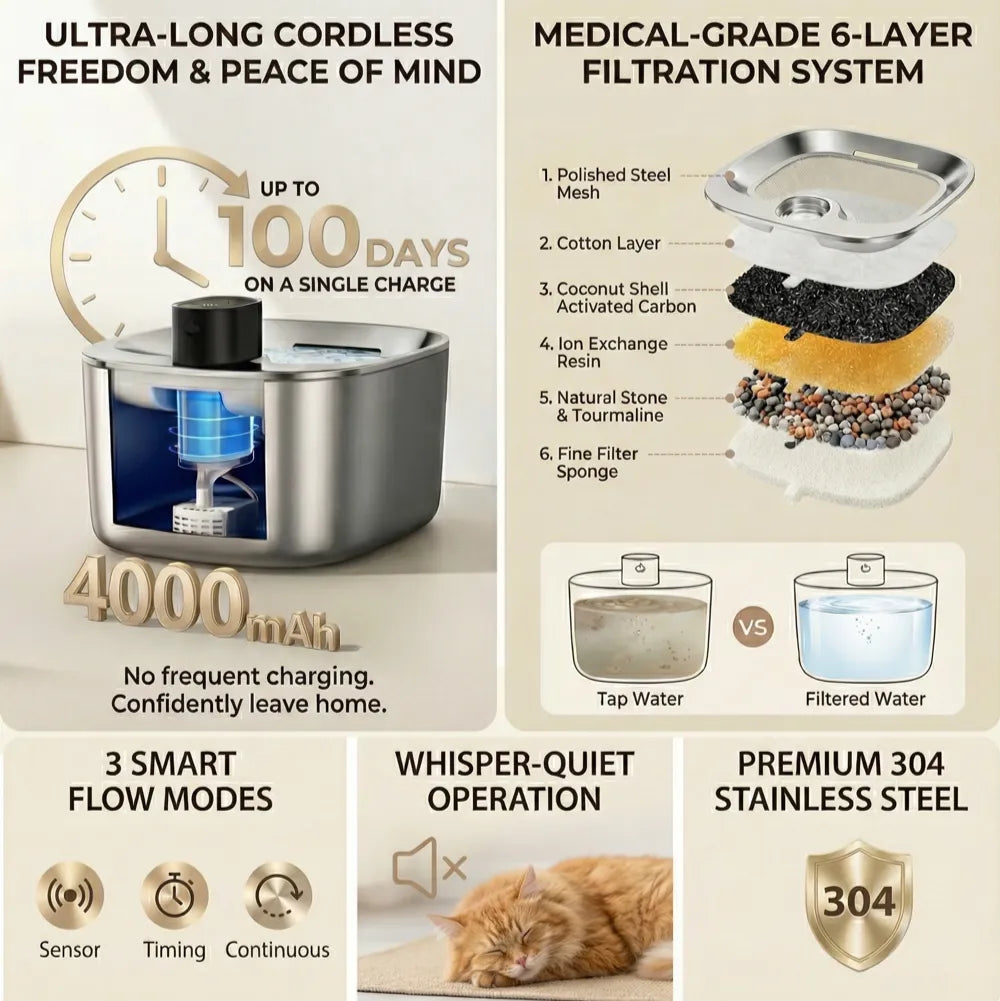 One charge powers 60–100 days of fresh, filtered water. Clean, reliable, and totally worry-free.