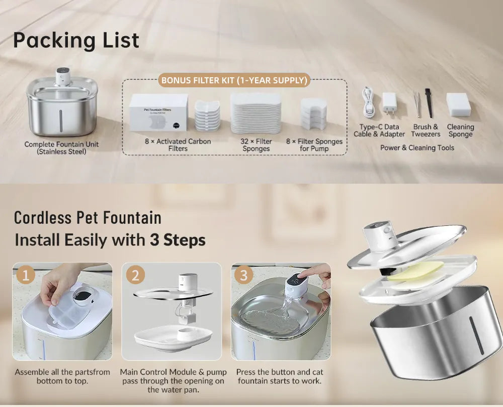 Cat fountain wireless 135fl oz/4L*1,Main control module and pump*1,Filter & 4 x Filter sponge*1,TYPE-C USB cable and power adapter*1,Cleaning set*1,User manual*1